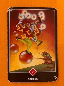 今月は年末ということもあり、お仕事でもプライベートでもストレスを感じることがありそうです。そのストレスとは、あれもこれも、それもどれも、やるべきことが多すぎるというストレスです。このカードのピエロは、玉乗りをしながらジャグリングをしながらラッパを吹いています。そばでは自分がコントロースする側であるはずのサルが、針を持って裏切ろうとしています。こんな究極のストレス状態から解放されるには、全部やめて玉から降りればいいのです。自らあれこれ抱え込まないこと、玉から降りる選択肢も持つことをカードは助言しています。