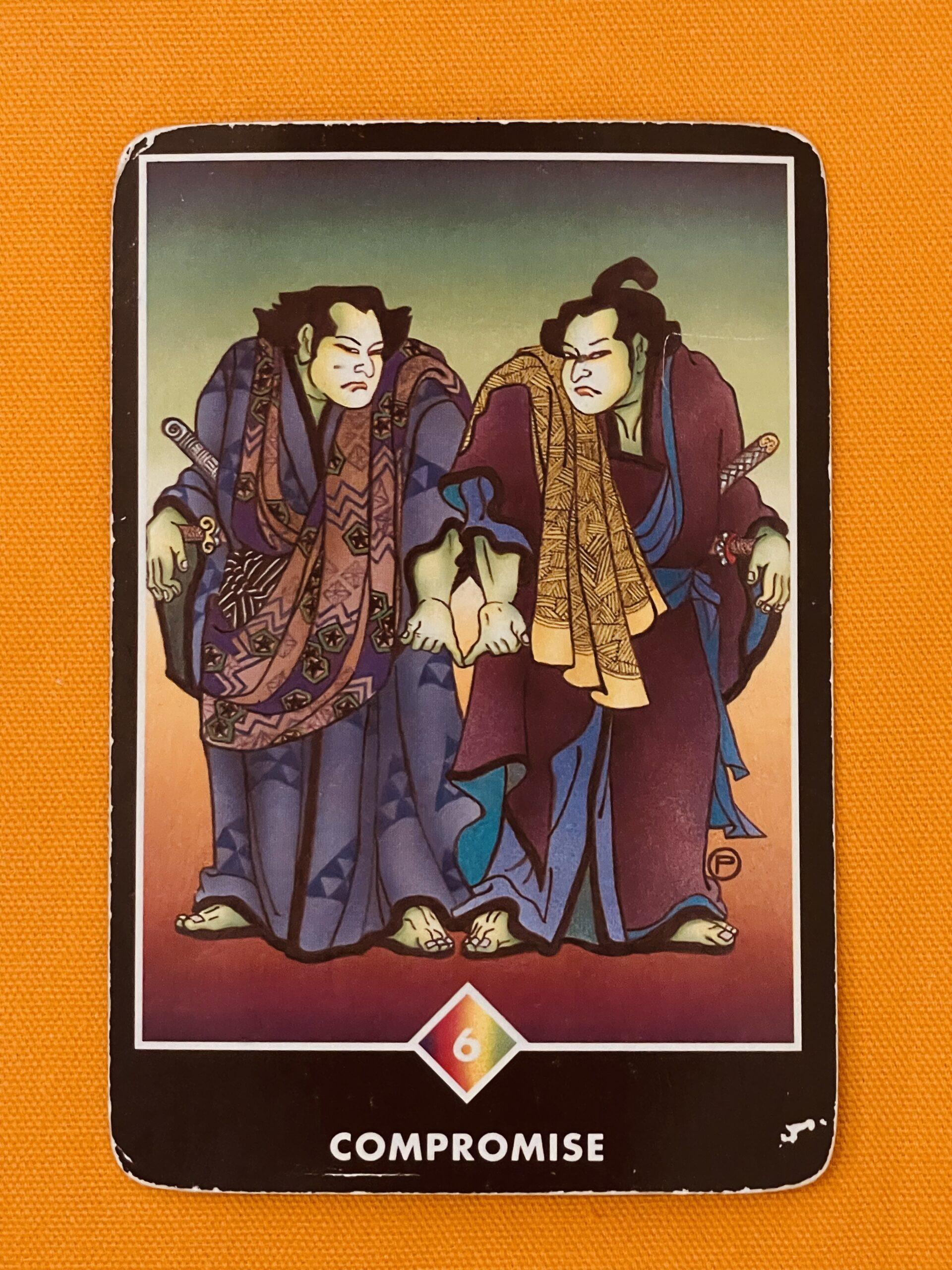 妥協というカードは、あなたが現在妥協させられるような局面にいることや、妥協しがちな状態でいることを表しています。自分さえ折れれば、この場を丸く収めるためには、そんな思考を働かせて、ある意味安易な解決法を取ろうとしています(解説書では”浅はかな茶番劇”と揶揄されています)。歩み寄り、自分たちとは違う見地を理解し、反対勢力との調和を目指して働くことと、屈服し、自分の真実に背くこととは全く別です。この手の妥協で得られるものは、後味が悪いのが常です。